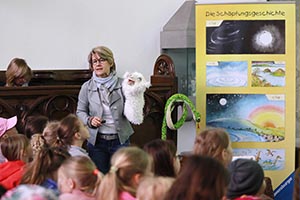 Die Veranstaltung bietet eine unterhaltsame Mischung aus spannenden Geschichten wie der Schöpfungsgeschichte und handfesten Informationen, etwa zum Leben der Nomaden oder zum Fischfang am See Genezareth. Kleine Spieleinlagen beleben die sachlichen Ausführung: so tritt immer wieder das Schaf auf, eine eigens für dieses Buch, von der Hamburger Künstlerin Valérie Bayol geschaffene Klappmaul-Handpuppe. Die zischelnde Schlange und das Nomaden-Zelt (Teppich mit vielen Kissen und orientalischen Gerätschaften) sorgen für anschauliches Lernen.